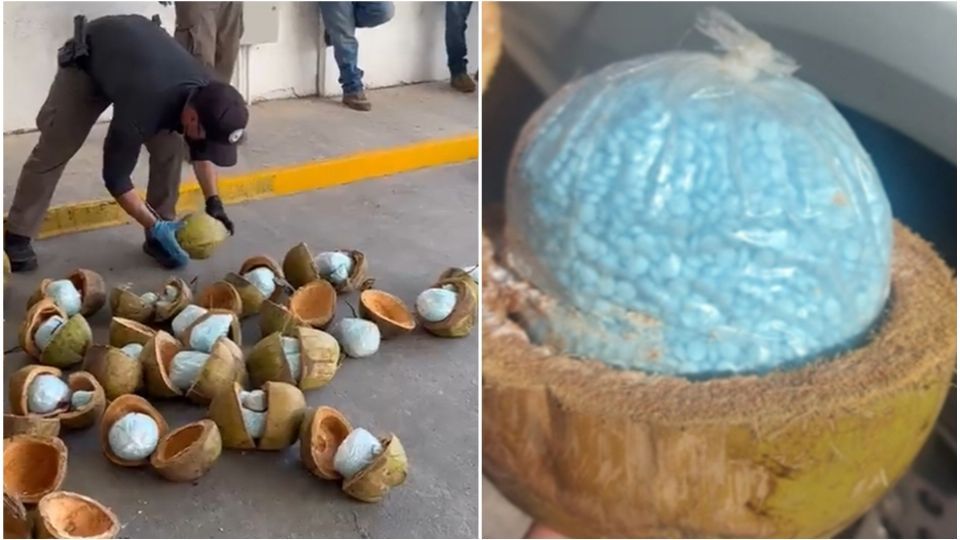 De acuerdo con los primeros reportes, los cocos estaban partidos por la mitad y en su interior transportaban bolsas con cientos de pastillas de color azul con dicha droga sintética. Asimismo se confirmó la detención de dos sujetos.