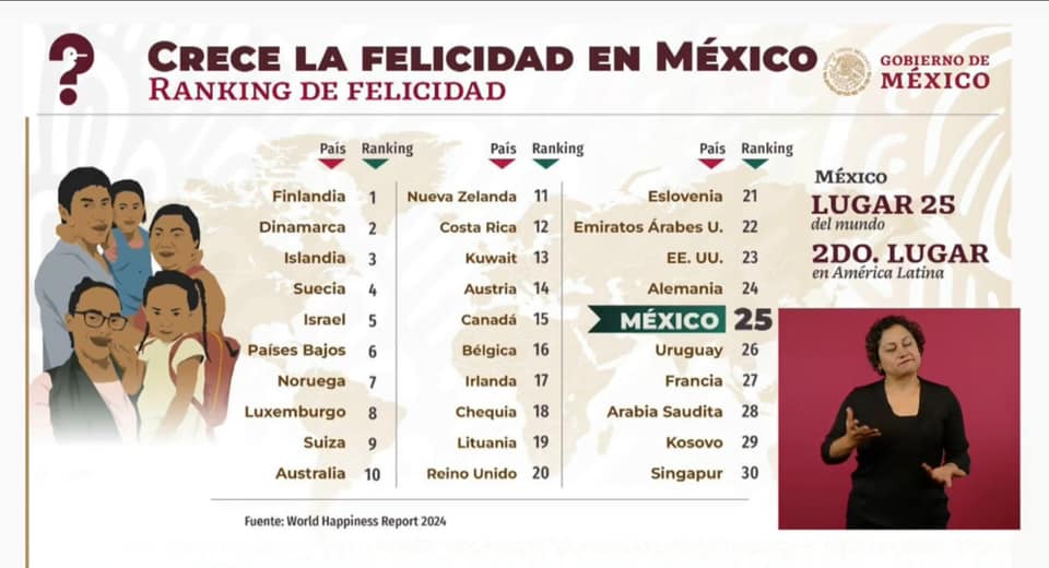 De acuerdo al World Happiness Report 2024, México ocupa el lugar 25 en el ranking de felicidad a nivel mundial; y el número 2 a nivel América Latina.
