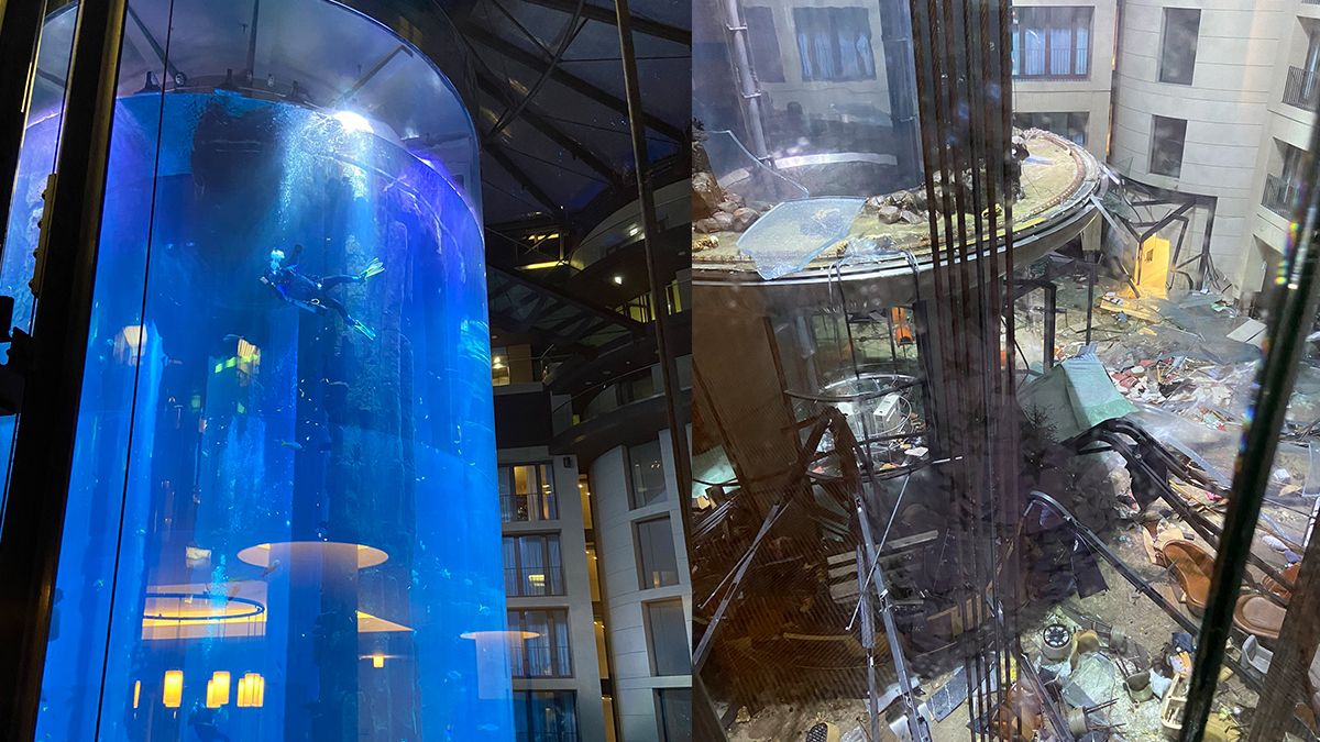 La madrugada de este viernes un gigantesco acuario que contenía un millón de litros de agua y más de 100 especies explotó en la recepción de un hotel en el centro de Berlín, inundando el edificio y las calles vecinas.