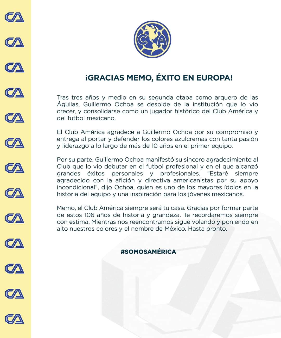 El club, agradeció a Memo por su “compromiso y entrega al portar y defender los colores azulcremas con tanta pasión y liderazgo a los largo de más de 10 años”, además de reafirmarle que “el Club América siempre será tu casa”, son algunas de las palabras que se pueden leer en el escrito.